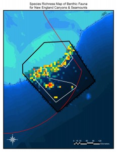 This map shows hot and cold spots for species of bottom-dwelling animals in the New England Canyons and Seamounts areas. Species are especially diverse along the edge of Georges Bank, where the shelf descends into the deep ocean. Hot spots are also visible on Bear, Physalia, Retriever and Mytilus Seamounts. Courtesy of Peter Auster and Michel McKee, Mystic Aquarium