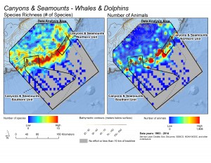 These maps illustrate patterns in the richness of species (left) and total numbers of whales and dolphins (right) observed during surveys in the Northeast Canyons and Seamounts region. Warmer colors indicate greater richness or abundance. Note how species concentrate on the eastern Georges Bank, where the shelf descends into the deep ocean, and hot spots for concentrations of whales and dolphins dot the shelf-edge. Courtesy of Scott Kraus and Brooke Wikgren, New England Aquarium