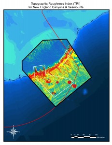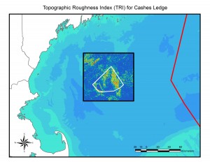 Topographic roughness – essentially, small-scale bumpiness of the seafloor – is linked to the distribution and diversity of microhabitats that in turn support a diversity of species. Warmer colors indicate greater “roughness” and are linked to locations of species-rich communities. For example, the area of high roughness on the top of Cashes Ledge (right inside the proposed monument boundary) is where the kelp forest is located and a species diversity hotspot. Courtesy of Peter Auster and Michel McKee, Mystic Aquarium