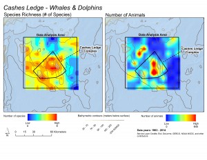 These maps illustrate that while whale and dolphin species are distributed throughout the whole Cashes Ledge region, the deep water toward the center of the proposed monument area is a hot spot for both the total numbers of species (left) and the total numbers of animals (right). Courtesy of Scott Kraus and Brooke Wikgren, New England Aquarium