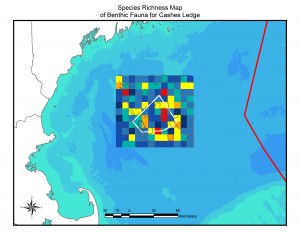 This map illustrates the pattern of species richness (number of species) of bottom-dwelling animals in the Cashes Ledge area. Warmer colors indicate more species. The largest red diversity hot spot is the peak of Cashes Ledge, where the largest continuous kelp forest on Cashes Ledge is located. Note that this map displays number of species, not numbers of individuals or density of animals. Courtesy of Peter Auster and Michel McKee, Mystic Aquarium