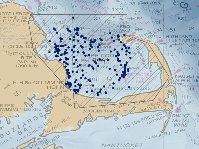 Vessels 65 feet and greater in length are required to travel at 10 knots or less in Cape Cod Bay and off Race Point as a part of NOAA’s Right Whale Ship Strike Reduction regulations. All vessels less than 65 feet in length–recreational and commercial–are asked to voluntarily comply with the 10 knot speed restriction at this time.