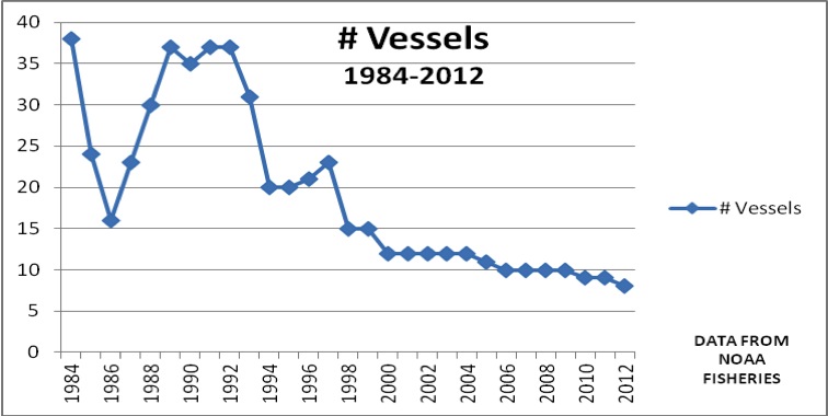 But the article does not discuss the role of climate and environment, two major influences on recruitment. While the commercial fleet has declined by about 79% since the mid 1980s (from 38 vessels in 1984 to 8 vessels in 2012), environmental conditions have fluctuated widely, producing circumstances that are alternately favorable and unfavorable for menhaden recruitment. Conditions in the late 1970s and early 1980s proved favorable, during a period when the menhaden industry was significantly larger than it is today; conditions since have been considerably less so. The relationship between menhaden and climate is recognized both by NOAA, which concludes, “menhaden recruitment appears to be independent of fishing mortality and spawning stock biomass, indicating environmental factors may be the defining factor in the production of good year classes,” and the ASMFC, which concluded that fluctuations in menhaden abundance may be, “almost entirely driven by non-fishery sources.”