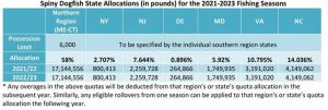 The Atlantic States Marine Fisheries Commission’s Spiny Dogfish Management Board approved a commercial quota of 29.6 million pounds for the 2021/2022 and 2022/2023 fishing years (May 1–April 30). The quotas are consistent with the measures recommended to NOAA Fisheries by the Mid-Atlantic Fishery Management Council (Council). State-specific allocations are provided in table below.