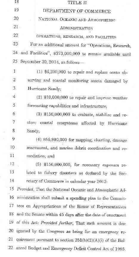 Read the relevant section of the Disaster Assistance Supplemental Appropriations Bill that passed the Senate. Note that it includes the $150m for the 2012 fishery disaster declarations.