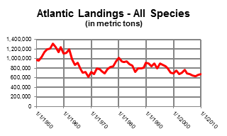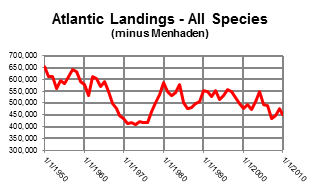 If they include menhaden, commercial landings on the East coast dropped by over 50%, or, exclusive of menhaden, over 30% in the 1950 to 2010 period.