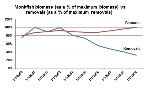 All things being equal, you would probably say that the monkfish stock had been severely overfished, was on the road to recovery but not there yet, so the declining harvest was a good thing.